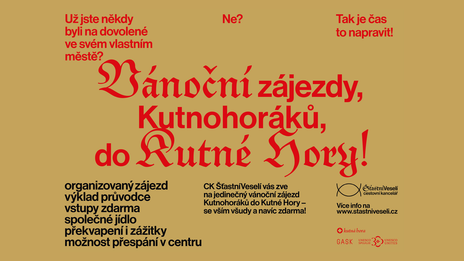 Kateřina Šedá a její cestovní kancelář Šťastní a veselí nabízí Kutnohorákům adventní projekt s jemně ironickým podtextem „vánoční zájezd do vlastního města“, který účastníkům pomůže odlehčit v předvánočním shonu a otevírá prostor pro setkání místních a zapojení co nejrůznorodějších skupin.